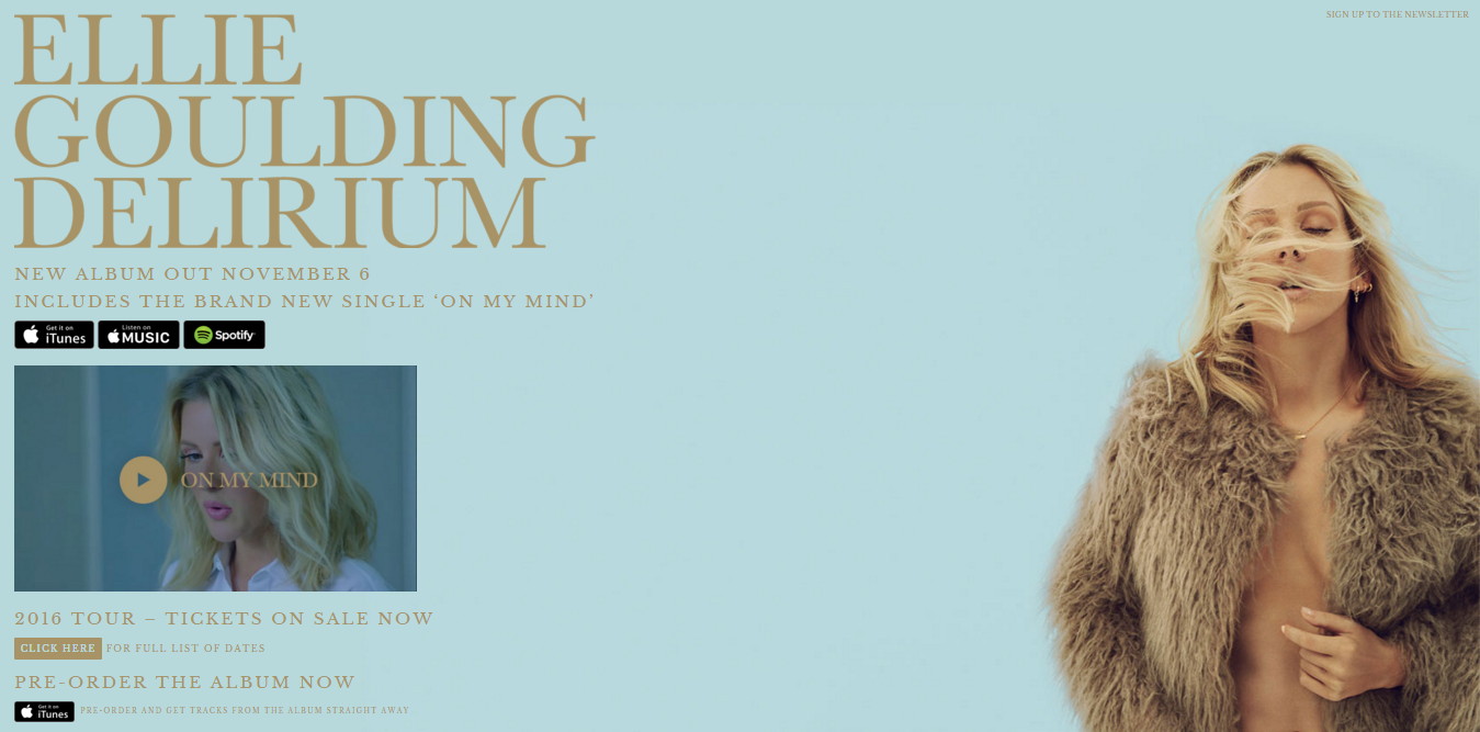 This website provided a lot of direction on what we wanted to avoid in our own website. Ellie Goulding's website is organised in a unique way, with lots of promotional links and advertisement on the left hand side and a lone picture on the right. As our band's values are more aligned with the music rather than the 'star identity' of some mainstream artists, we have made several decisions which differed to those made for this site.